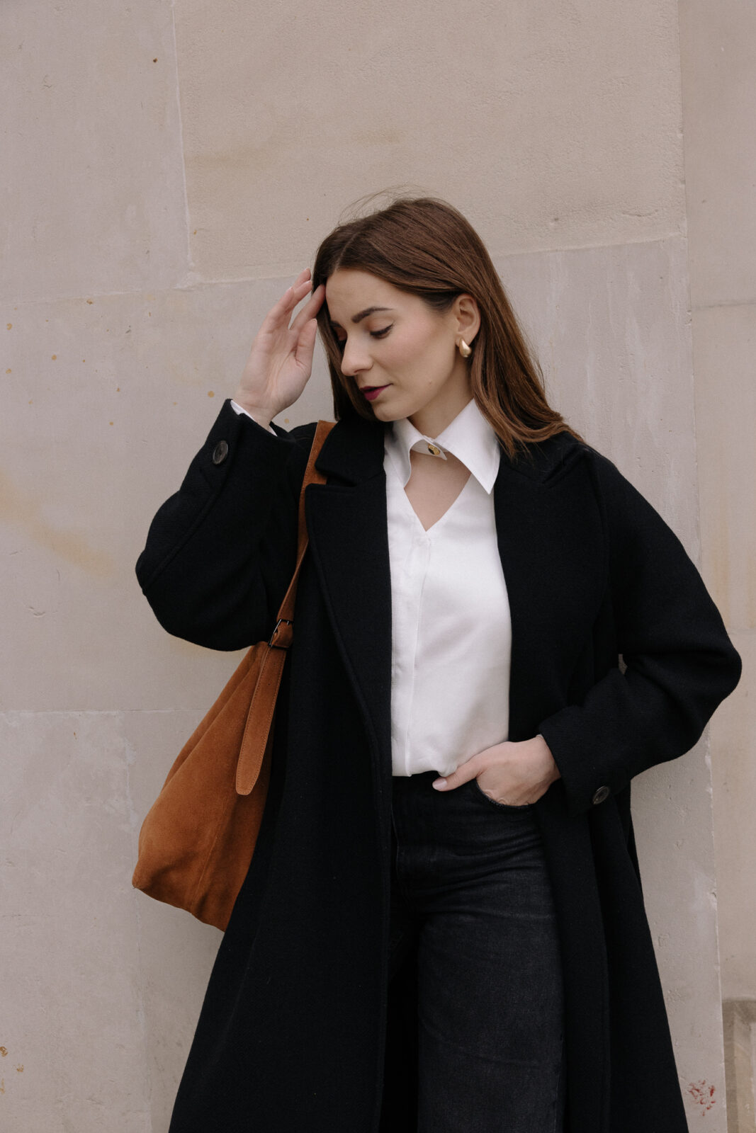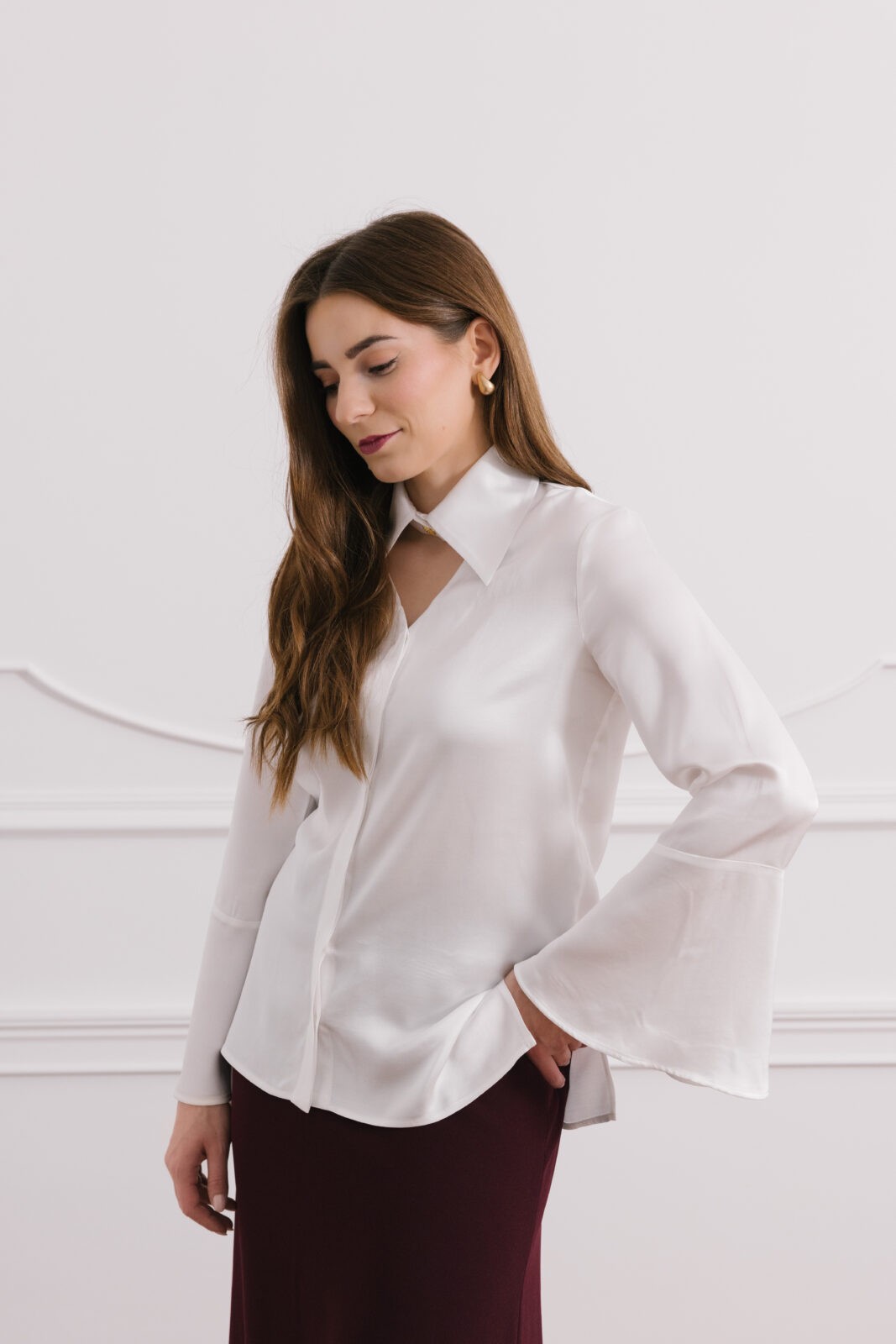 - Klasyczny, ponadczasowy krój wzbogacony o rozkloszowane mankiety – detal, który dodaje elegancji i wyjątkowości.