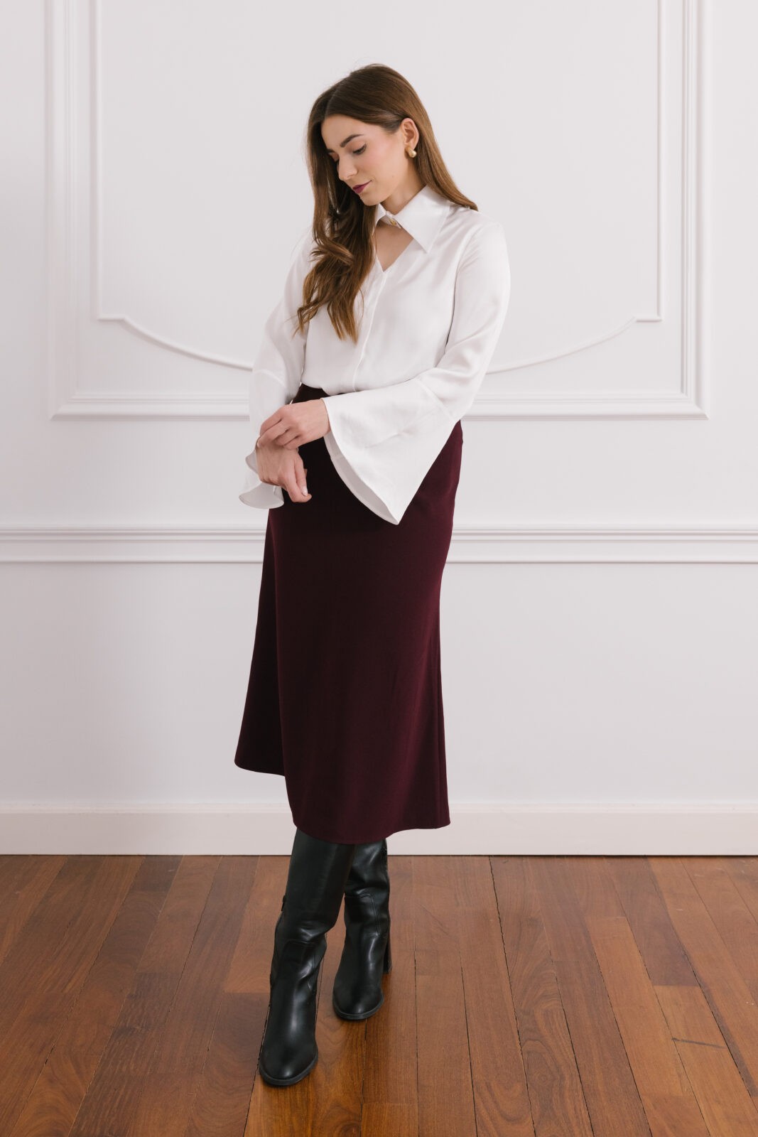 - Najwyższa jakość materiałów – tkanina jest miękka, oddychająca i delikatnie połyskuje, gwarantując nie tylko piękny wygląd, ale i komfort noszenia przez cały dzień, nawet ten najbardziej stresujący.