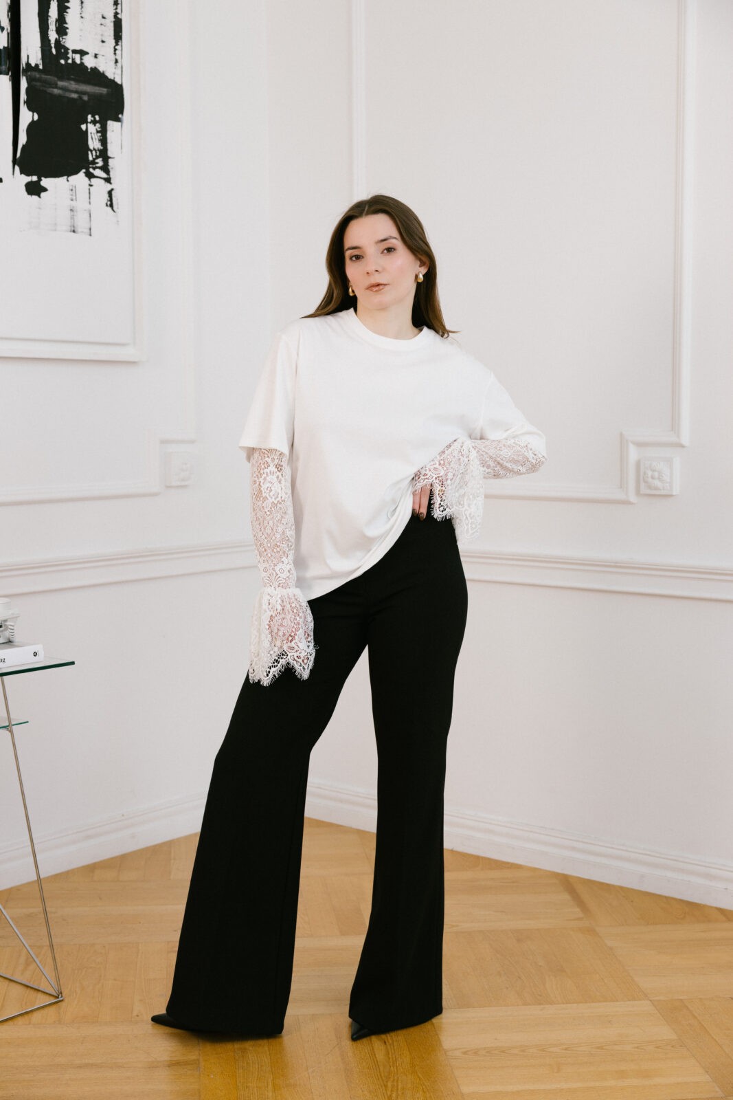 Na kawę z przyjaciółką: Luźno wypuszczony t-shirt, satynowa spódnica i sneakersy. Trio idealne, które zawsze działa. Dorzuć jeszcze koronkowe rękawki Clari 0.18, a Twój look nabierze wyjątkowego charakteru.