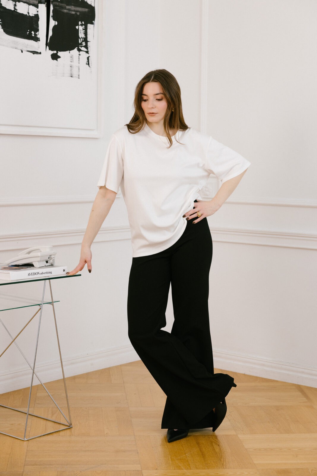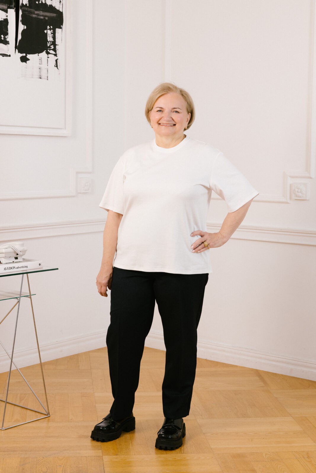 Do pracy: T-shirt oversizowy + eleganckie spodnie + loafersy + minimalna biżuteria. Zarzuć na ramiona marynarkę i masz look, który mówi „profesjonalizm”, bez sztywności”.