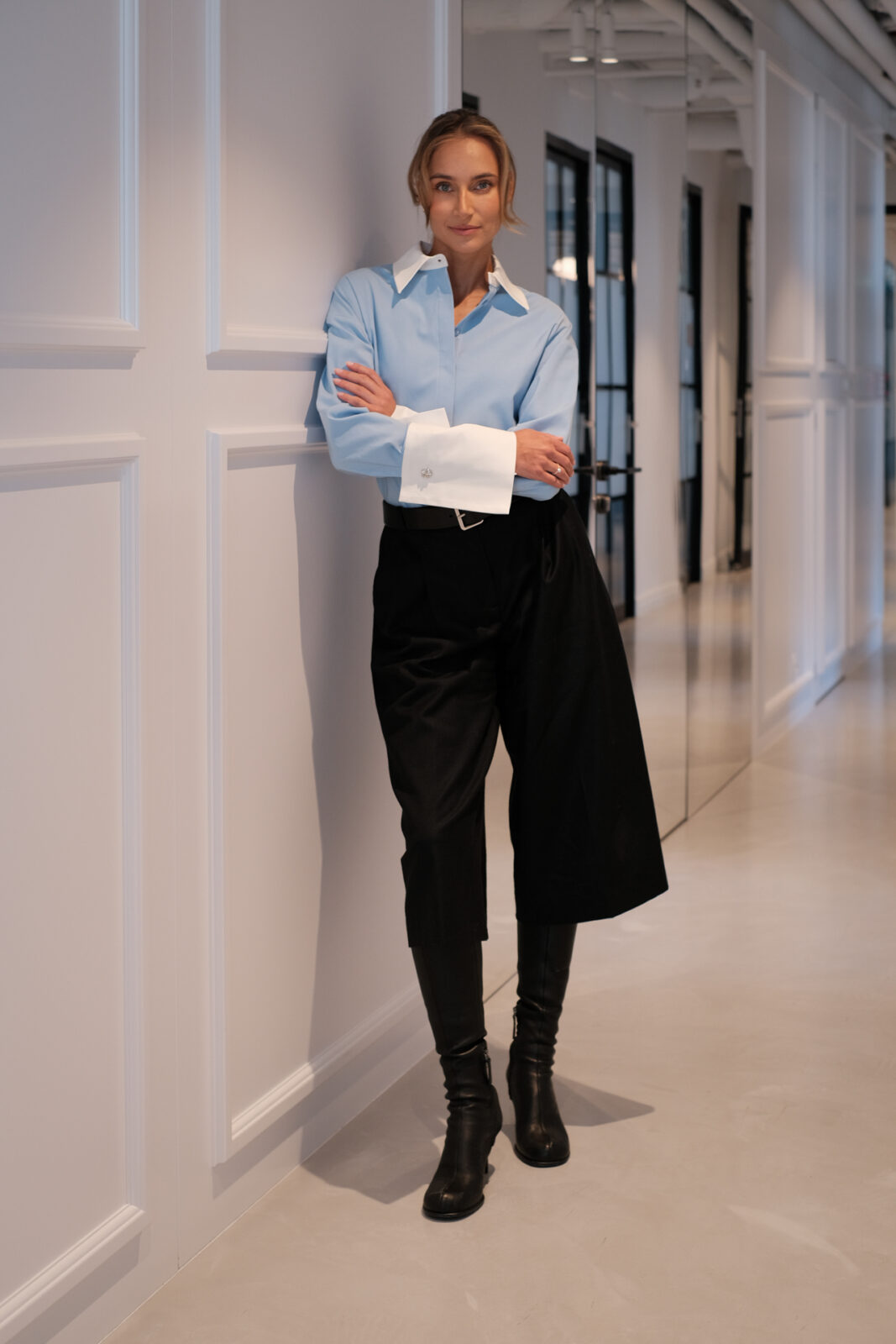 - Kontrast, który dodaje charakteru – błękitna koszula z białymi mankietami to połączenie, które nie krzyczy, ale przyciąga wzrok. Delikatne, ale zdecydowane.