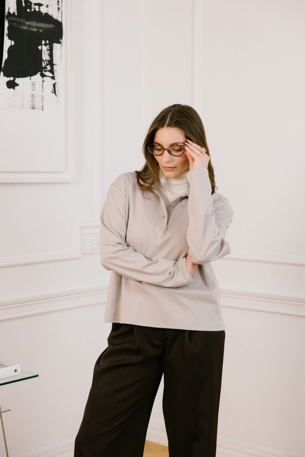 Clari 0.20 The Comfort Elegance to pierwsze polo w The Foundation Collection — minimalistyczne, wszechstronne, uszyte z mięsistej dzianiny, która otula, nie krępuje. W kolorze taupe, który pasuje do wszystkiego i nigdy nie wychodzi z mody.