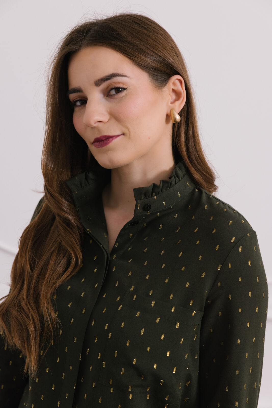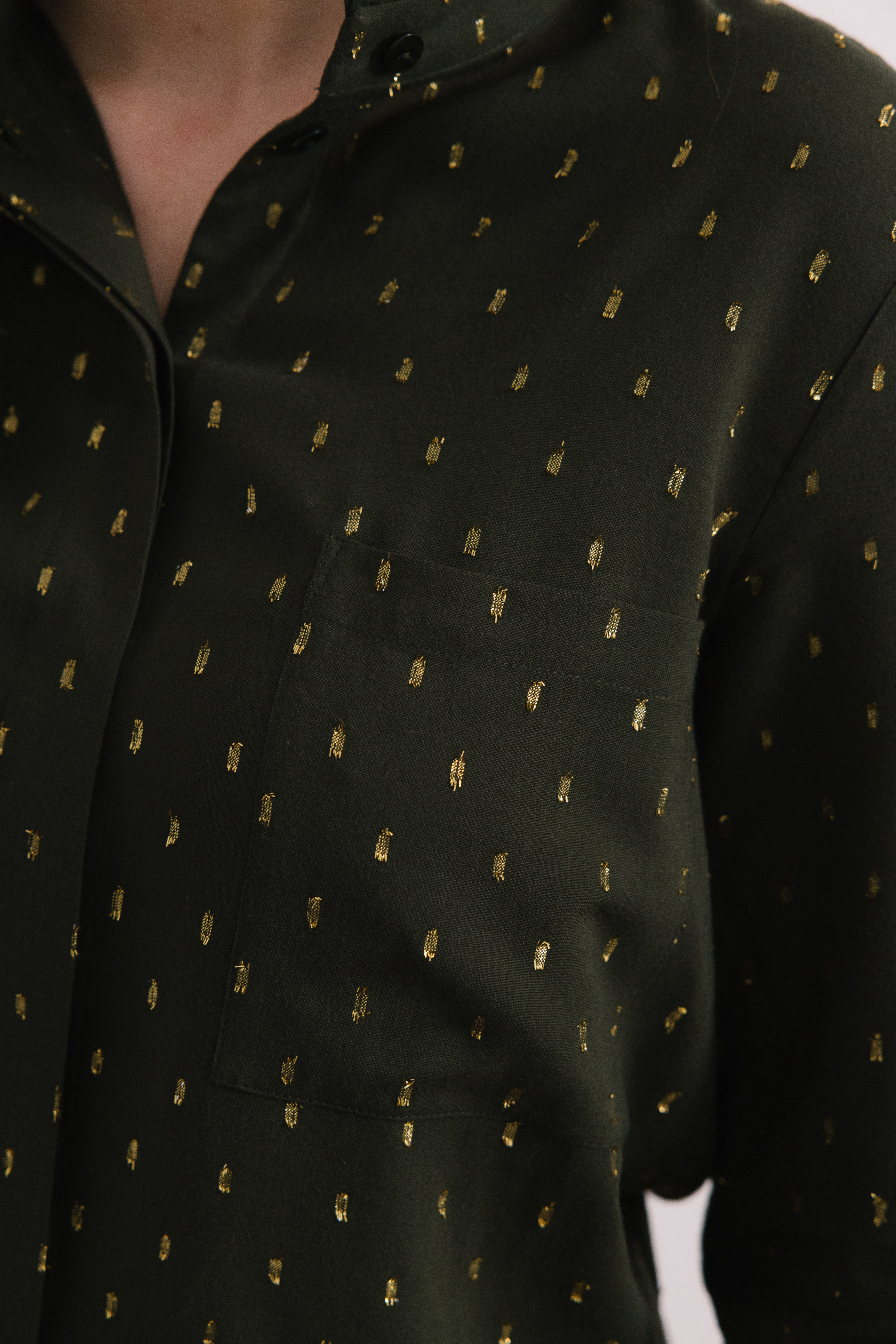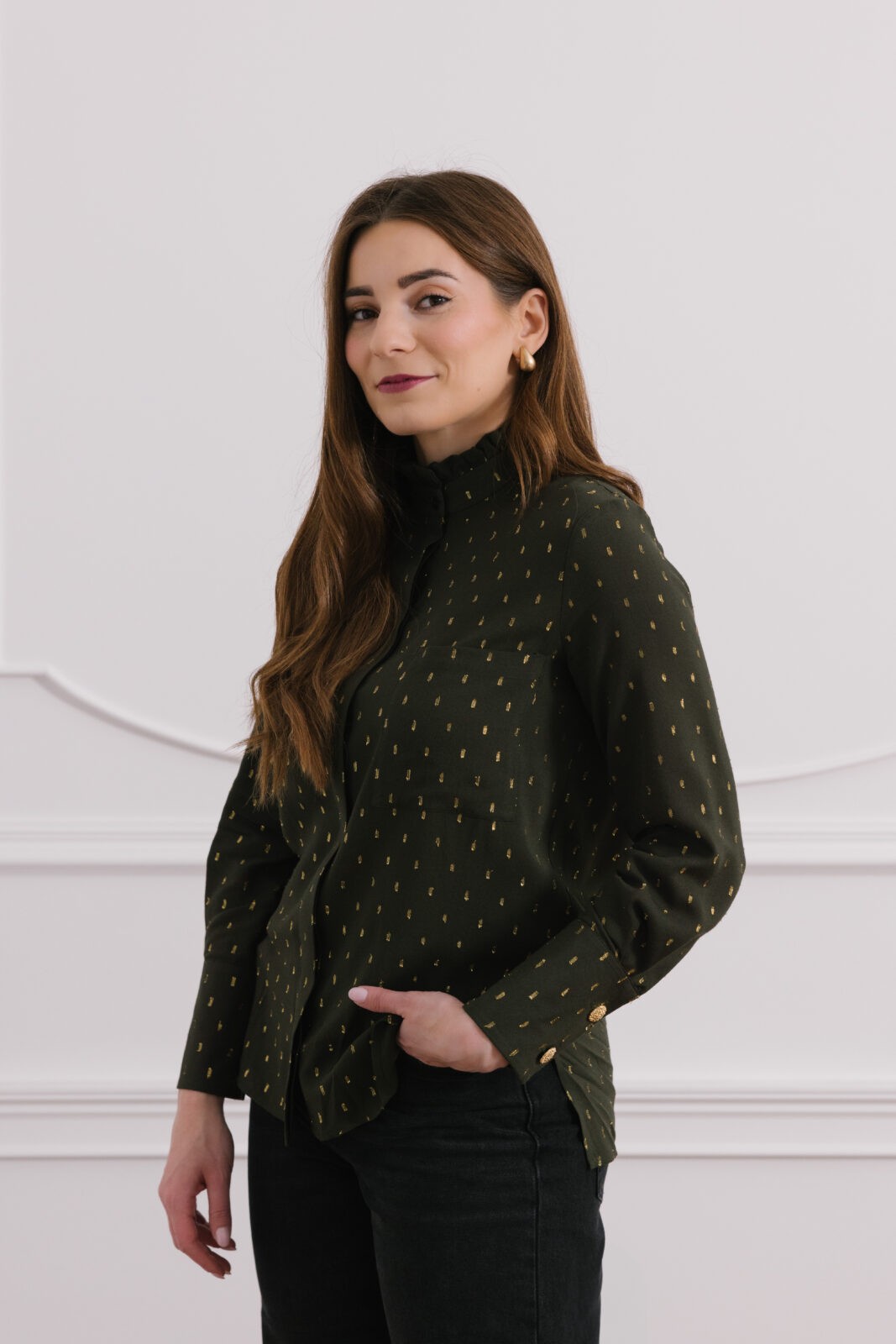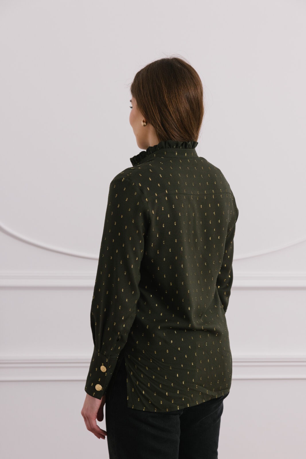 Dodaj do swojej garderoby odrobinę elegancji z tą wyjątkową koszulą w kolorze butelkowej zieleni. Wykonaną z miękkiej i przyjemnej w dotyku tkaniny. Koszula zachwyca subtelnym złotym wzorem, i falbanką, które połączone dodają szyku i ponadczasowego stylu każdej Twojej stylizacji.
