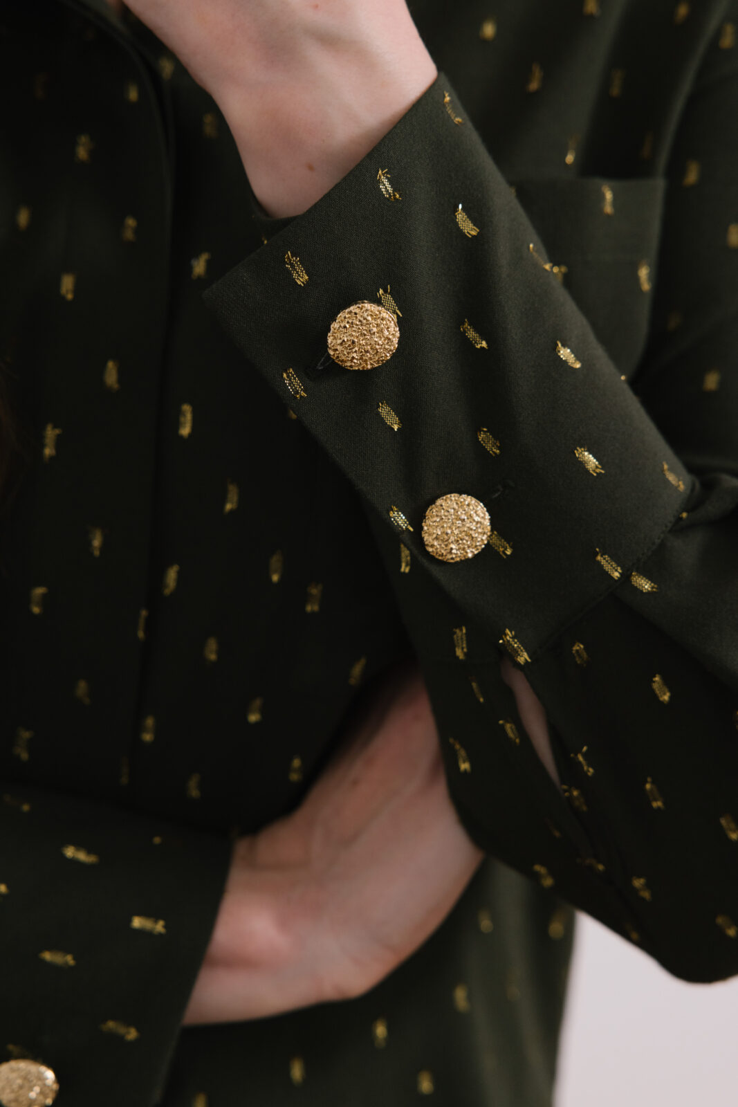 • Stylowe mankiety o wydłużonym kroju ze złotymi guzikami perfekcyjnie współgrają ze złotą nitką w tkaninie.