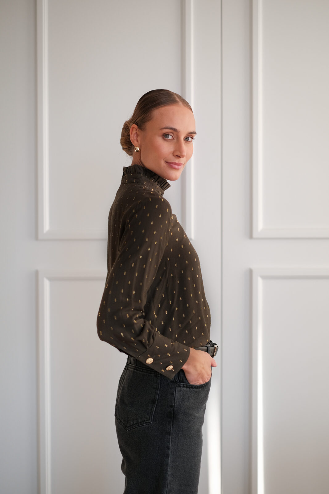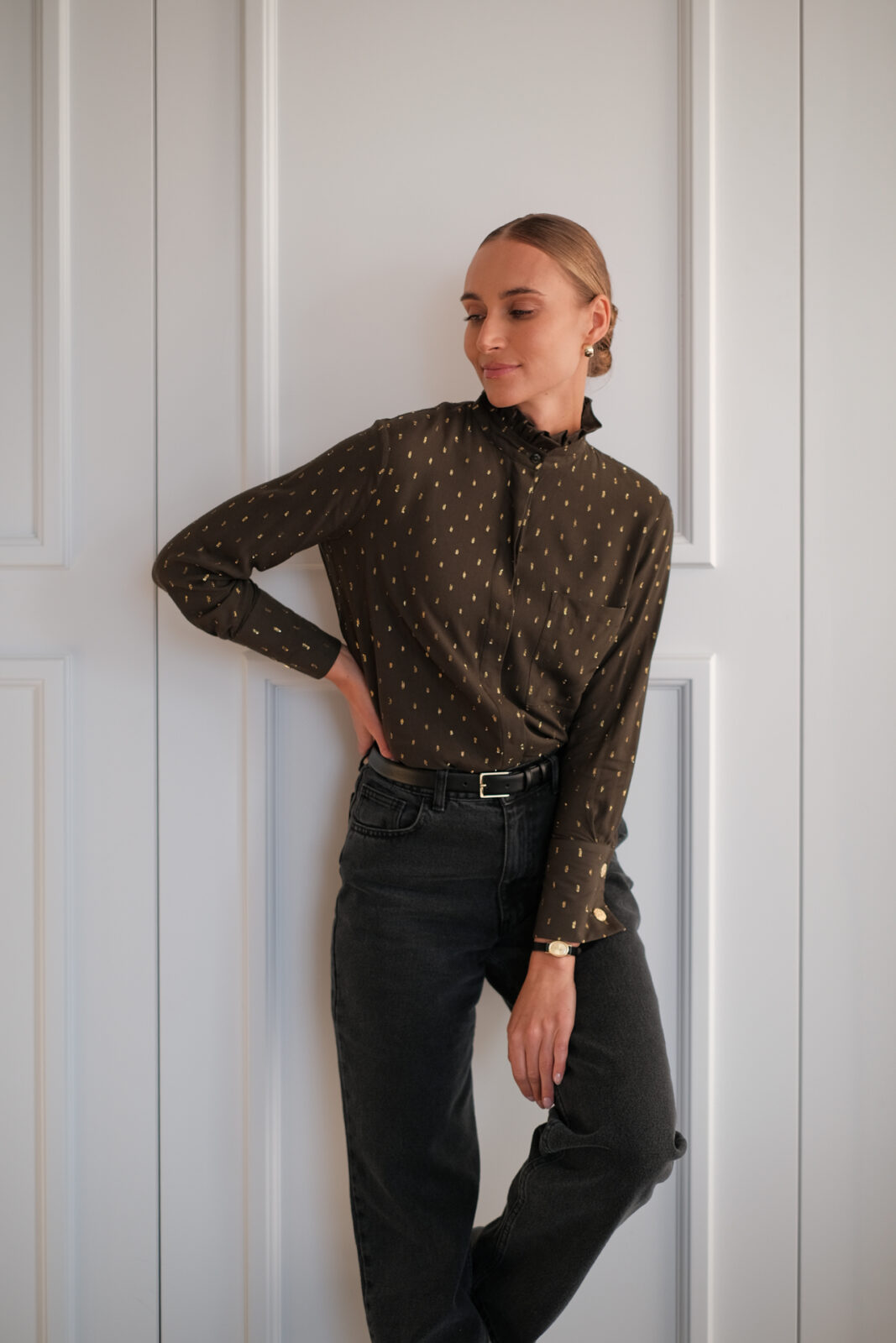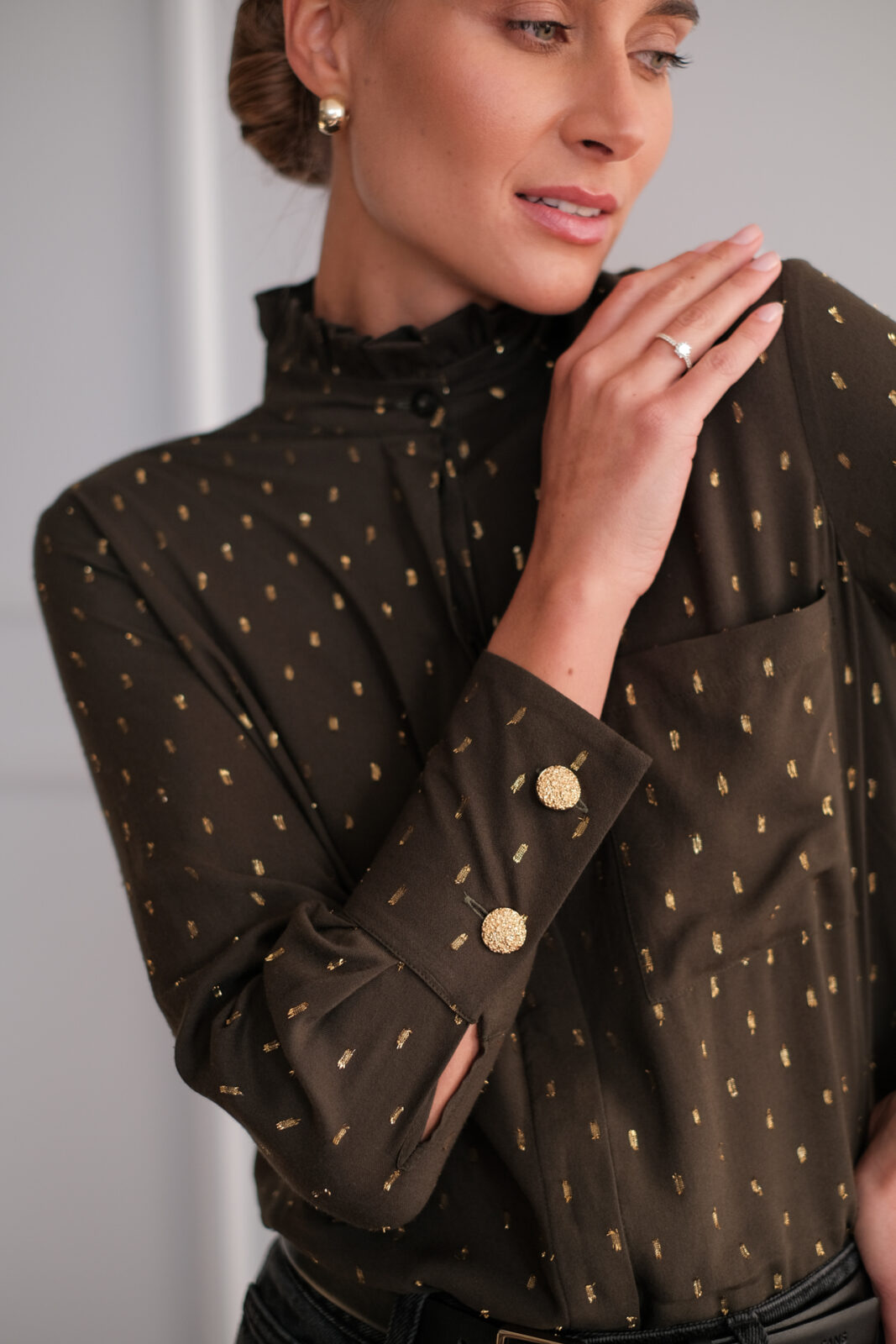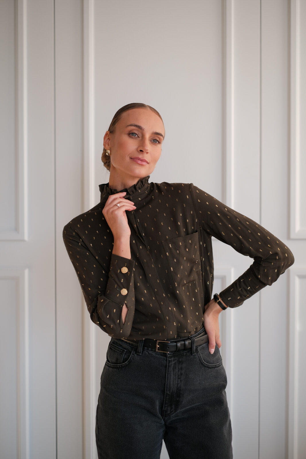 - klasyczny i ponadczasowy krój z delikatną falbanką, która dodaje lekkości i gracji koszuli,
