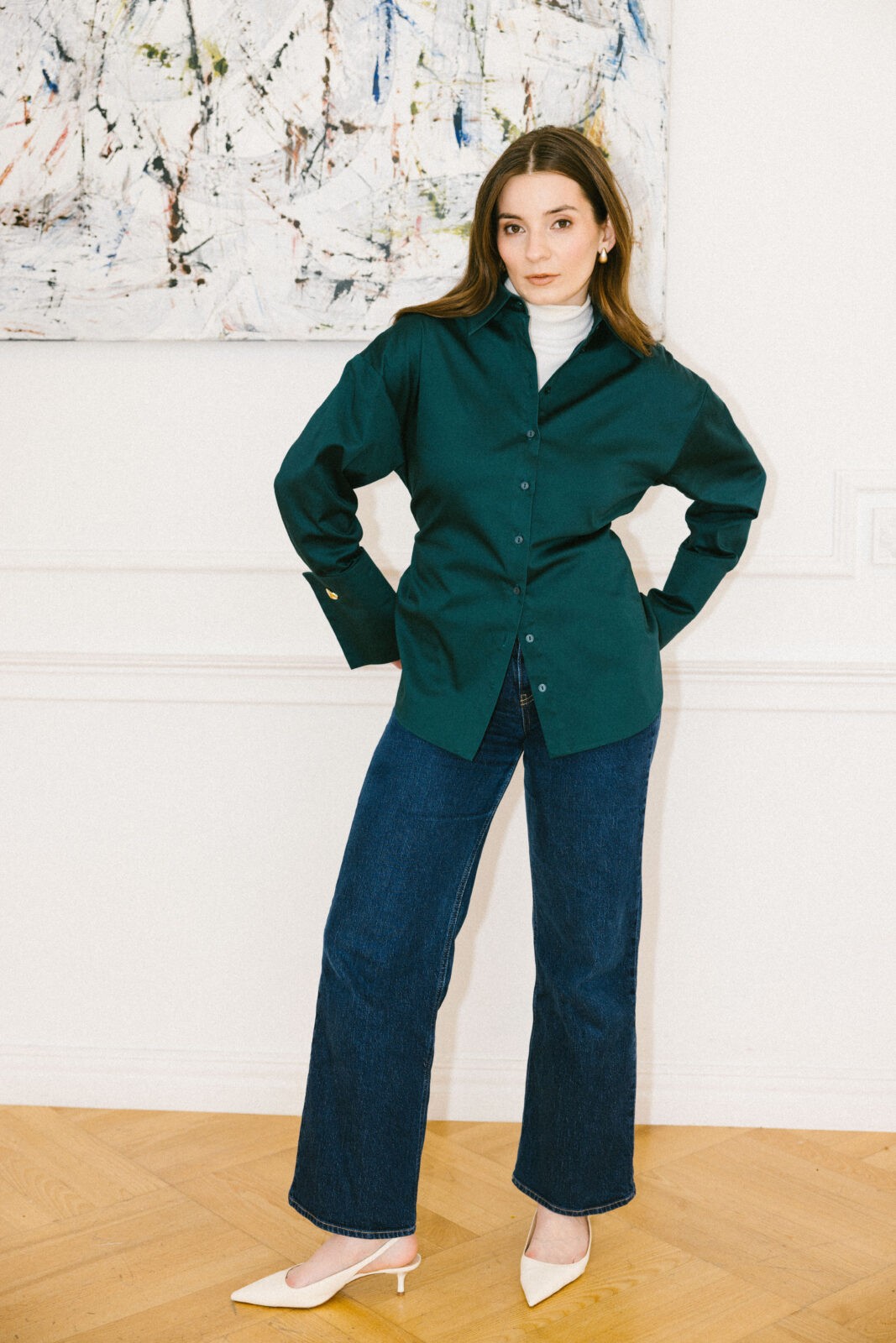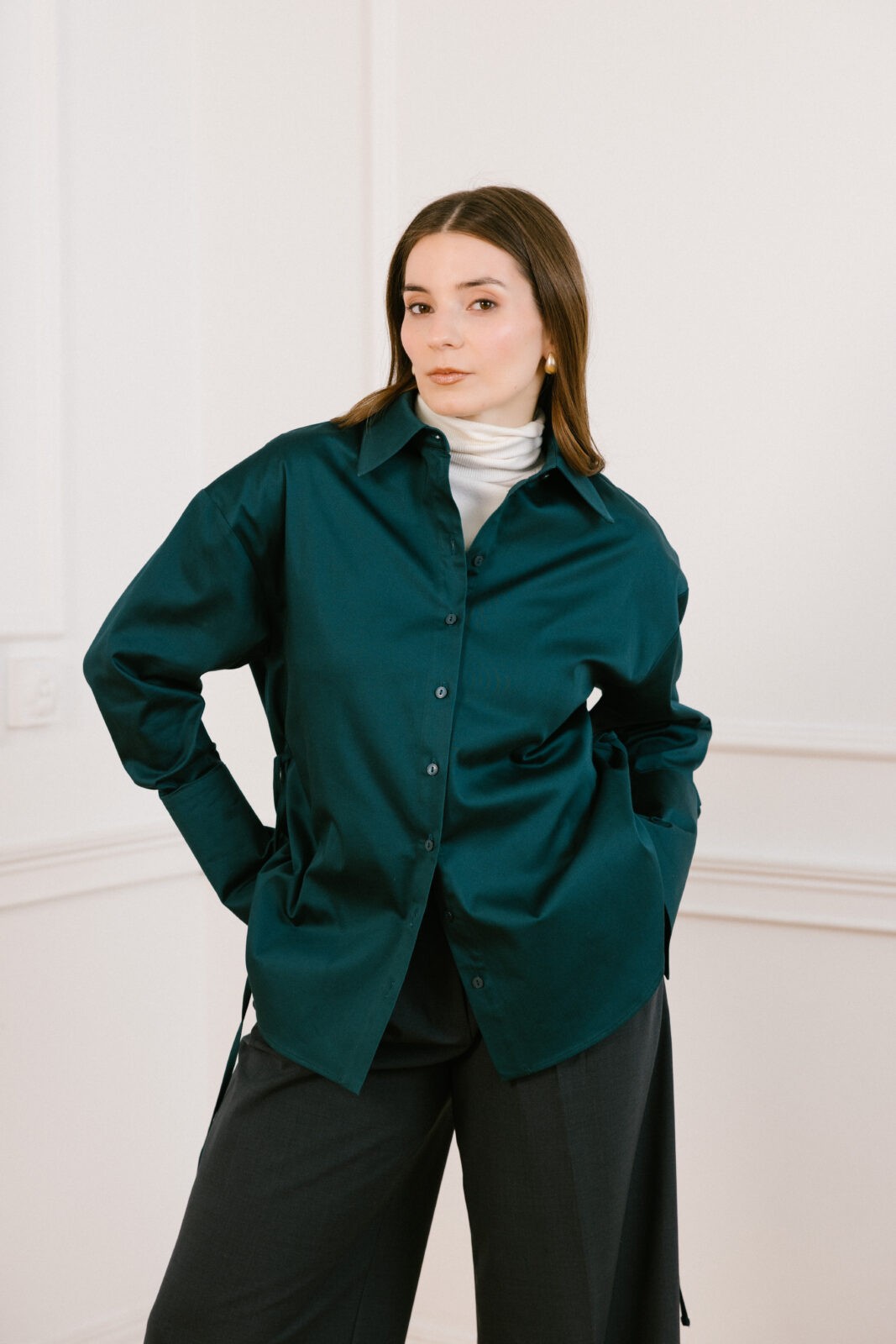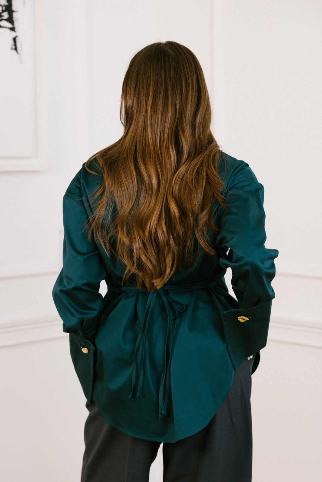 Clari 0.23 to nie jest kolejna prosta koszula. To deklaracja. Głęboka butelkowa zieleń, która przyciąga wzrok. Oversizowy krój, który daje Ci przestrzeń do bycia sobą. Wiązanie w pasie, które możesz dostosować do swojego nastroju – ściągnięte dla elegancji, luźne dla swobody. Duże mankiety ze złotymi guzikami dodające elegancji i nowoczesności.